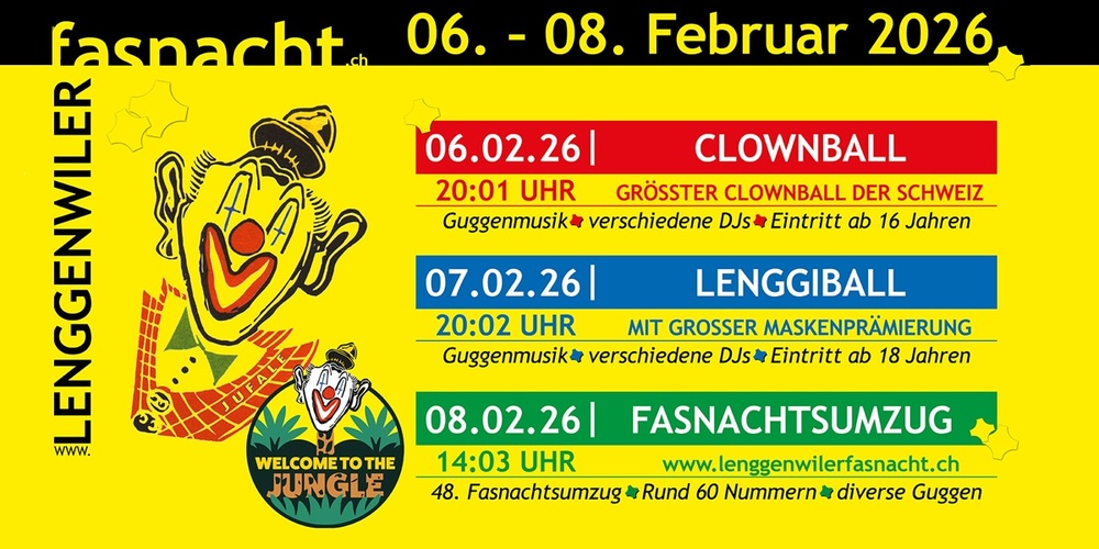 Vom 6. bis 8. Februar 2026 begeistert die Lenggenwiler Fasnacht mit Kultstatus, Guggenpower und Partystimmung – dieses Jahr unter dem Motto «Welcome to the Jungle».