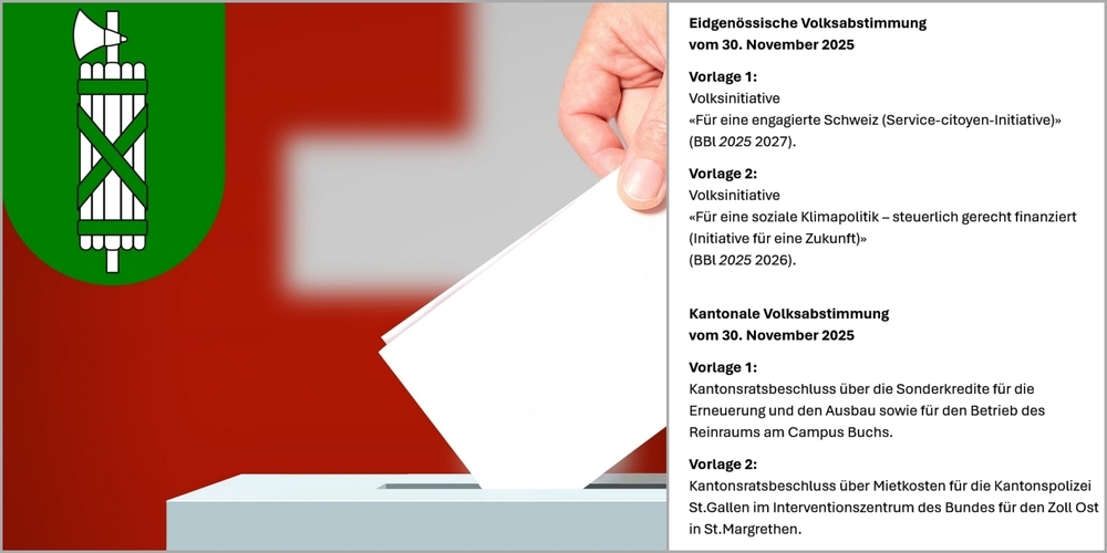 Am Sonntag, 30. November 2025 wird über zwei eidgenössische und zwei kantonale Vorlagen abgestimmt. Die Urne ist im Gemeindehaus Mogelsberg am Sonntag, 30. November 2025 von 10.00 bis 11.00 Uhr geöffnet.